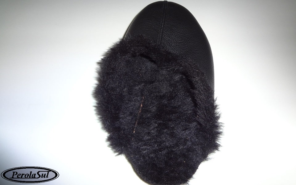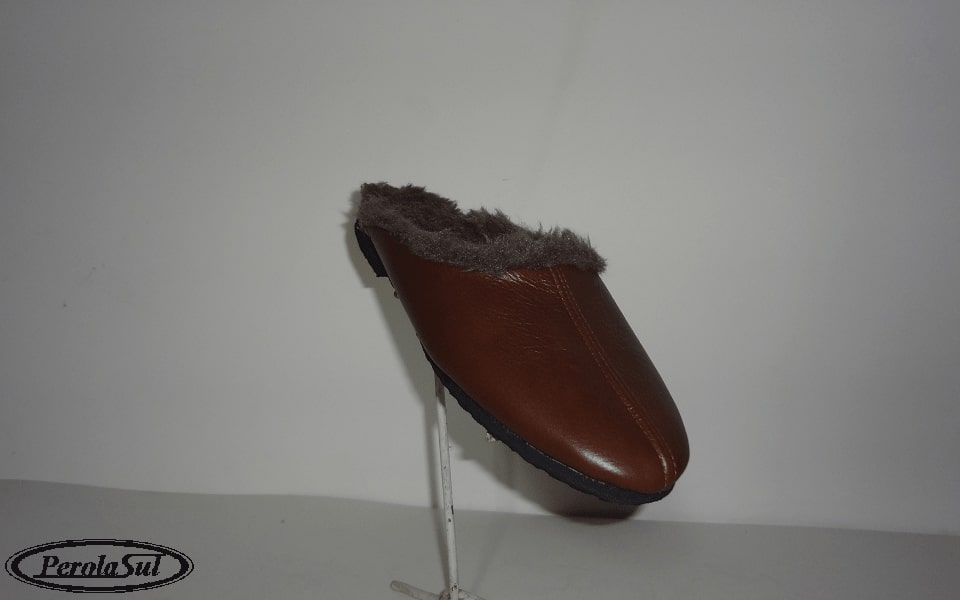 Chinelos fechados com foro de lã(sintética) e solado de EVA.